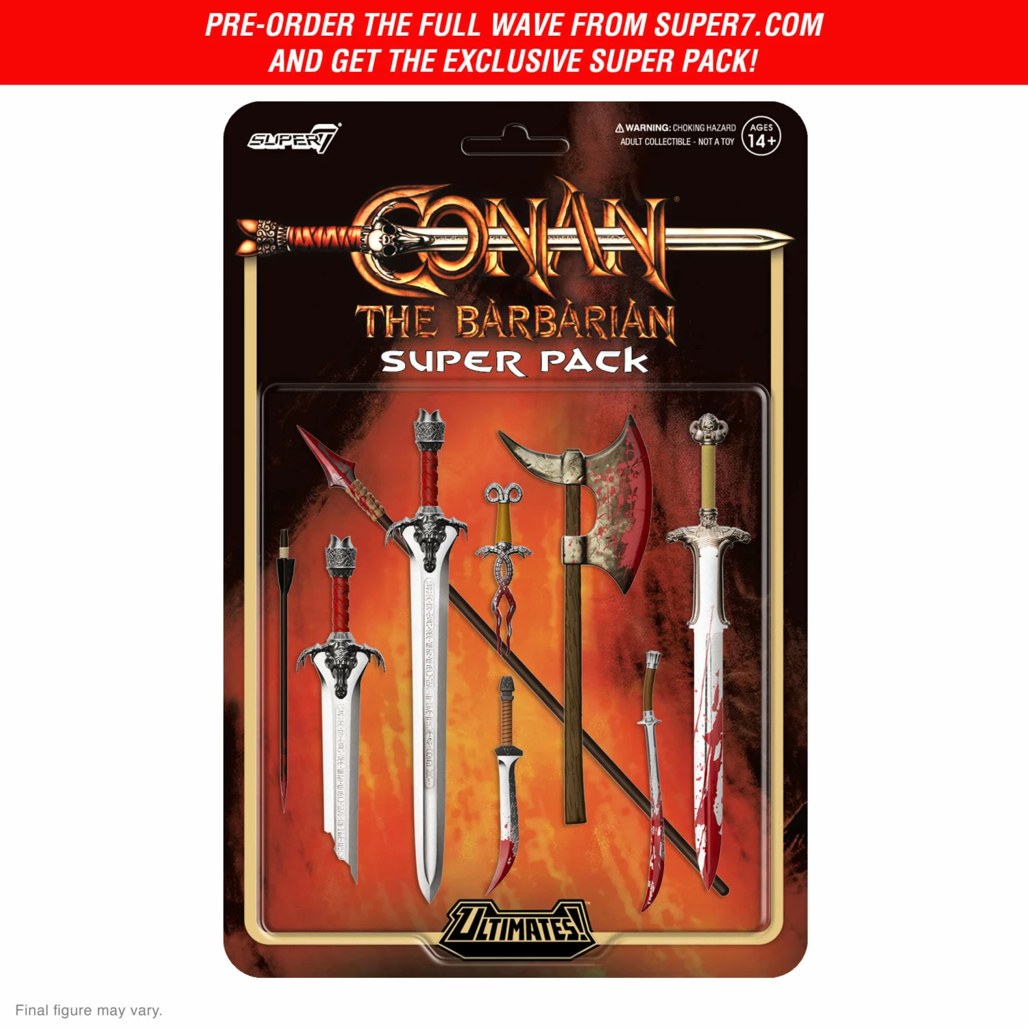 Assemble the complete Conan the Barbarian Wave 5 ULTIMATES! collection and receive an Exclusive Super Pack! An assortment of fierce and iconic weapons accessories to build your ULTIMATES! armory. Available only with the purchase of the full wave of Super7 ULTIMATES! Action Figures from Super7.com. By Crom!