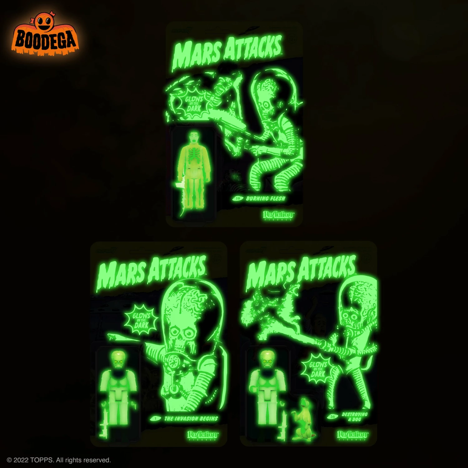 It’s never been easier to see that the Martians do not come in peace! Based on the vintage Topps trading cards, these glow-in-the-dark 3.75” articulated Mars Attacks ReAction Figures are packaged on cardbacks that also glow in the dark! The invasion doesn’t stop just because the lights go out, so add the glow-in-the-dark Mars Attacks ReAction Figures to your collection!