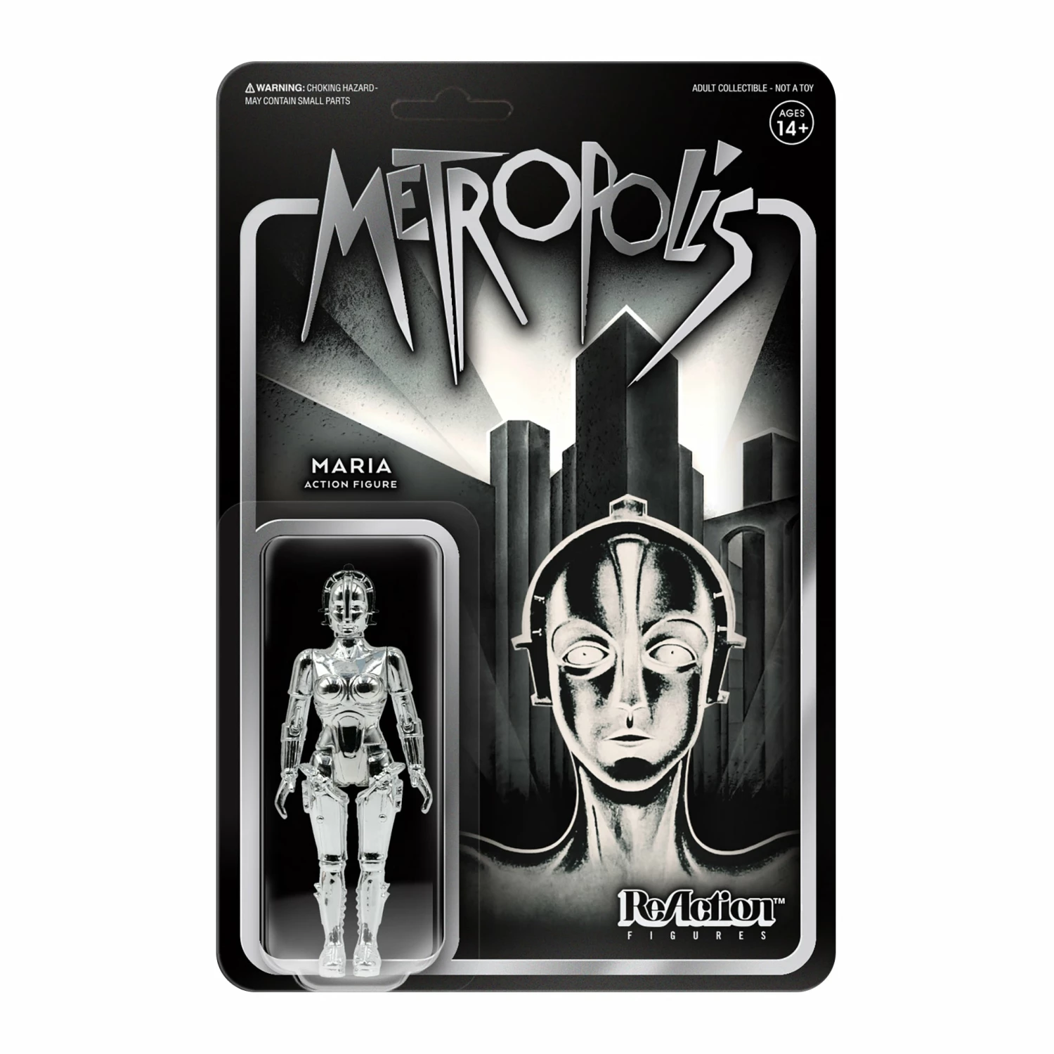 A silver screen icon, itβs only natural that Maria from the landmark film Metropolis be offered in dazzling silver. This 3.75β articulated ReAction Figure of Metropolis Maria is in stunning silver vac metal. Put some shine in your lineup of classic early cinema memorabilia and add this silver metallic Metropolis Maria figure today! Packaged on a foil enhanced cardback.