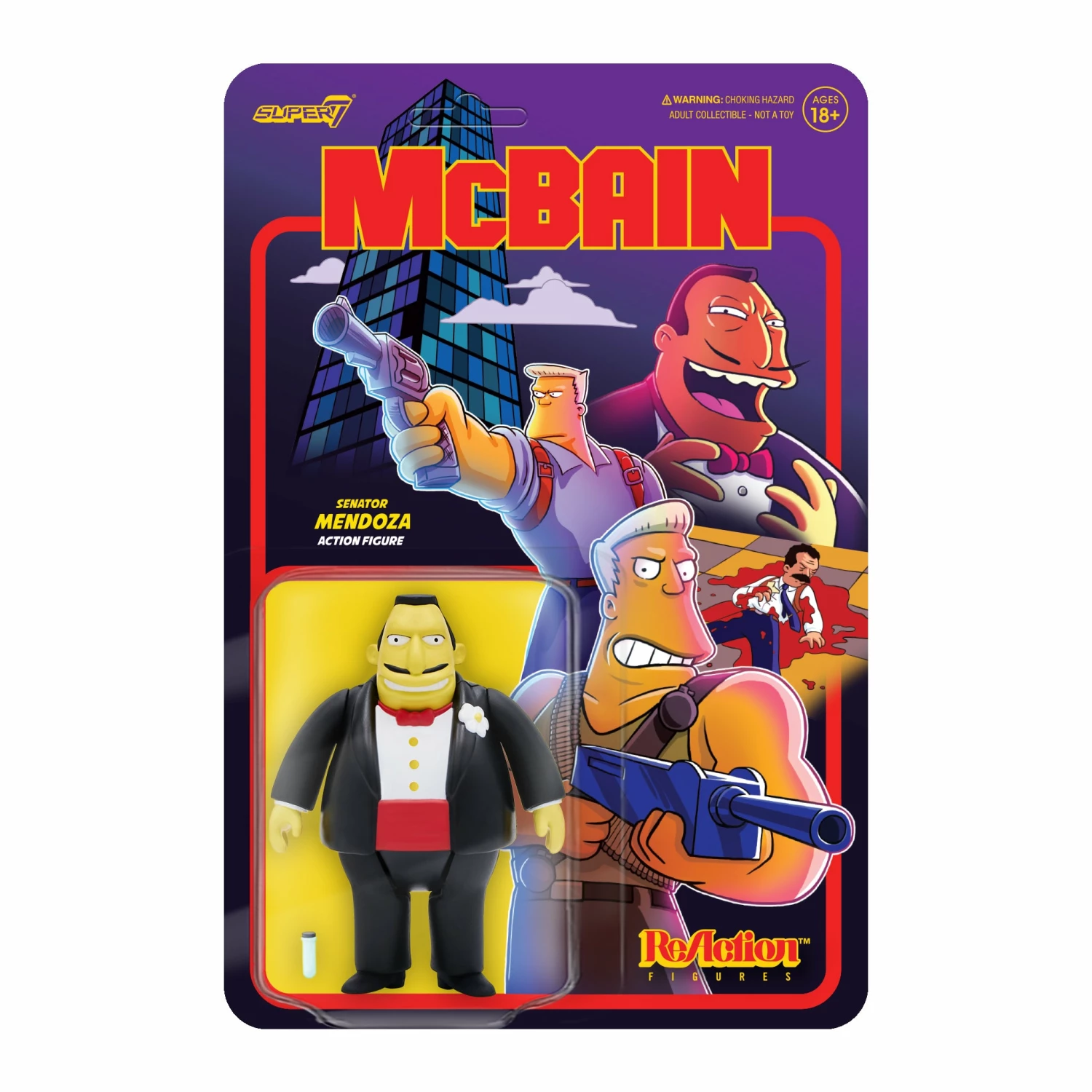 As seen in The Simpsons! This 3.75” articulated McBain ReAction figure of Mendoza shows McBain’s nemesis in his tuxedo outfit from the banquet scene where he announced the creation of Swank, his highly-addictive, diabolical new drug. Collect the entire line of The Simpsons McBain ReAction figures!